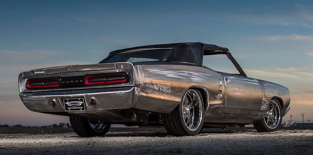 hood scoops from a 74 Challenger, bumpers from a 1970 Road Runner, and taillights from a 2016 Challenger.