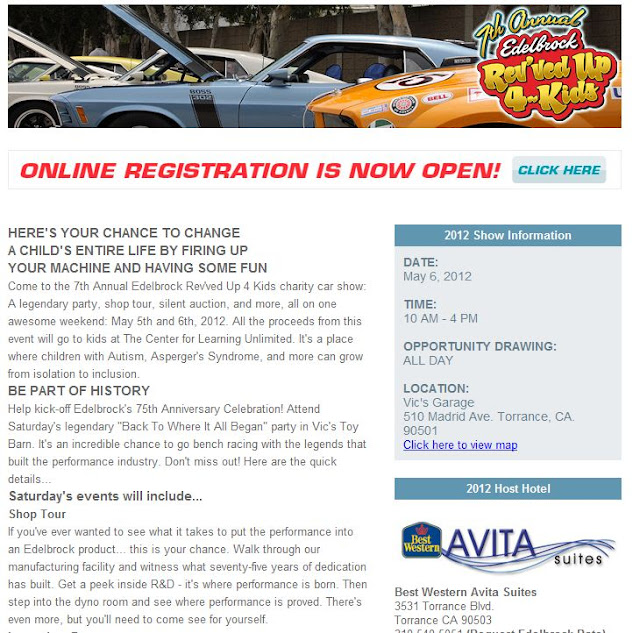 the annual Edelbrock "Revvedup for kids" car show is May 5th